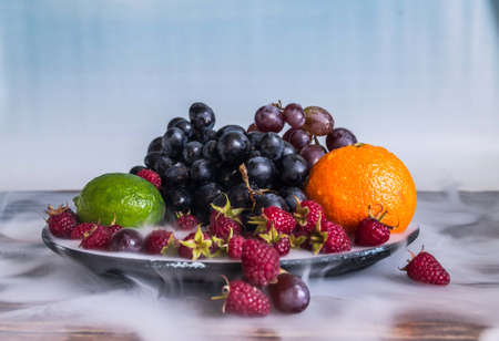 Currant, Cornus and dogberry, lemon and kiwi close-up, food photography