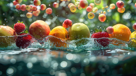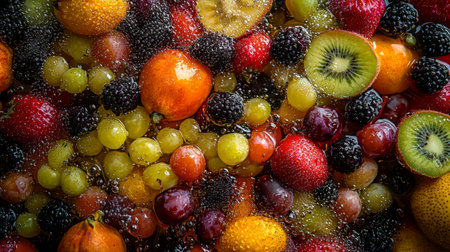 This image showcases a colorful assortment of fresh fruits, including grapes, strawberries, and kiwis, surrounded by glistening water bubbles, promoting health and freshness.