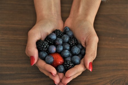 berries, fresh, in female hands, strawberries, blueberries and blackberries