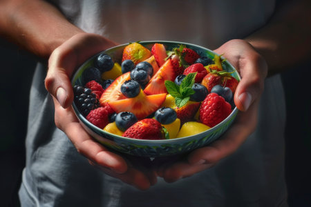 A person is holding a bowl of fruit, including strawberries, blueberries, and oranges. The bowl is filled with a variety of fruits, and the person appears to be holding it with care