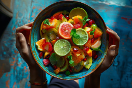 A person is holding a bowl of fruit salad. The bowl contains a variety of fruits, including oranges, strawberries, and kiwis