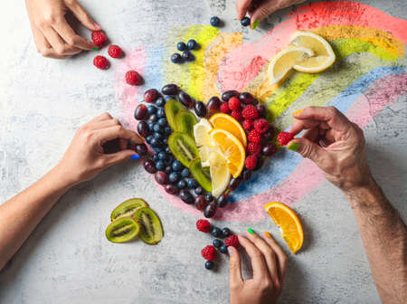 Fruit cut and arranged in order of rainbow colors forming a heart. Brushstrokes of the colors of the rainbow. Hands picking fruit. Gay Pride Day.