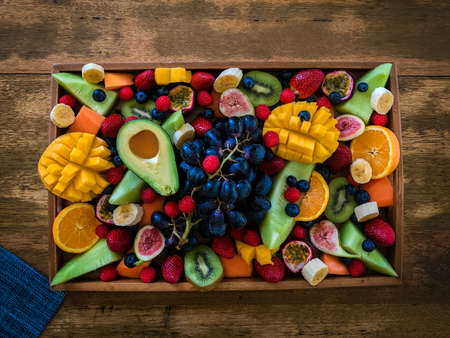 close up sliced assorted fresh tropical fruits platter,use a background