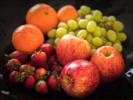 Various colorful fruit on dark background. Selective focus.