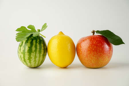 beautiful juicy ripe fruits red apple, yellow lemon and miniature green watermelon standing in a row close-up on a white background