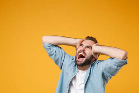 Mad young bearded man in casual blue shirt posing isolated on yellow orange wall background studio portrait. People lifestyle concept. Mock up copy space. Screaming, looking up, putting hands on head.