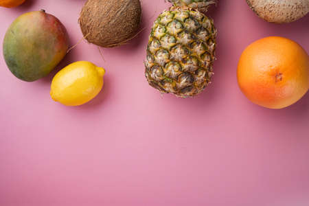 Top view of a composition with variety of fresh tropical fruits and green leafs arranged on a pink surface.