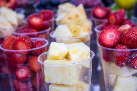 Closeup of assorted chopped fruits melons watermelons strawberries bananas in plastic glasses healthy lifestyle concept fruit diet