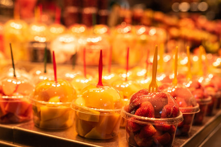 Close-up of fresh sliced fruits and berries with bamboo skewers. Assorted strawberries, pineapples, blueberries and oranges dusted with powdered sugar for a buffet