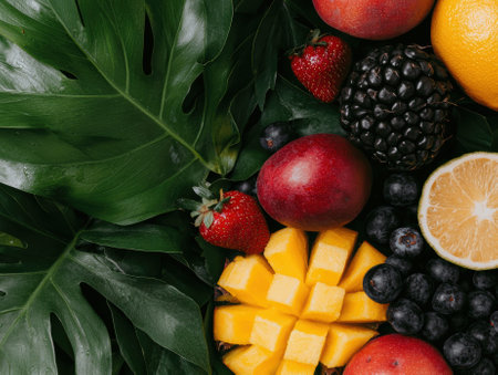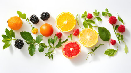 A vibrant display of fresh citrus fruits and berries artfully arranged with green leaves, perfect for health, wellness, and culinary themes. Ideal for food photography.