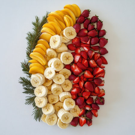 A vibrant display of neatly sliced bananas and strawberries is arranged artistically on a light background, showing a blend of colors and textures.