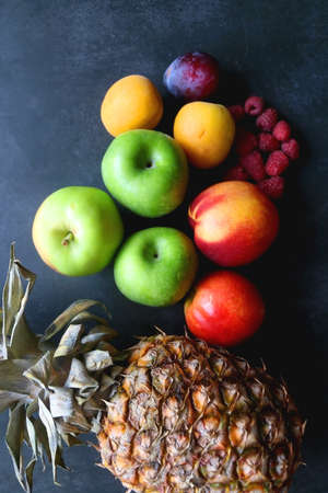Watermelon, pineapple, apples, peaches, apricots, plum and raspberries on dark background. Flat lay.