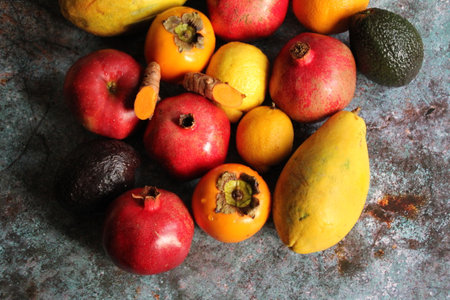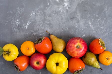 Different seasonal fruits on a concrete background. Source of vitamins and health. Healthy eating concept. Copy space.