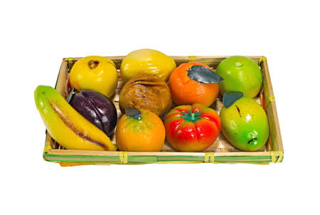 Thai traditional dessert call Kanom Look-Choup made from mung bean paste moled in various shape such as mango, apple, peach ,etc. Packed in plastic box on marble background