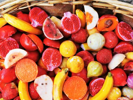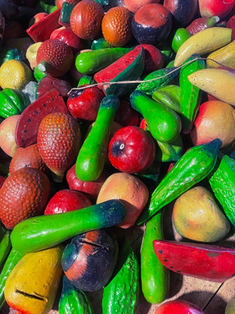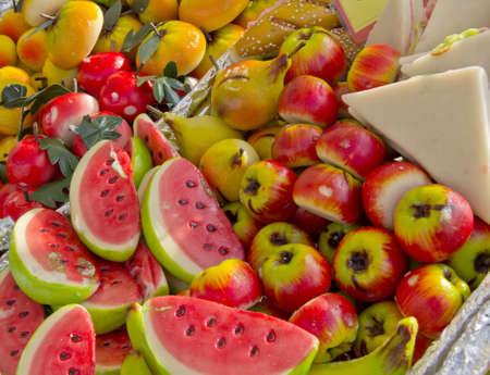 Colorful candy made like fruit and vegetables. Market in city of Nice, France.