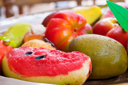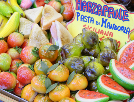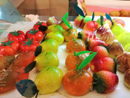 typical sicilian marzipan pastries in shape of various colored fruits also known as frutta martorana.