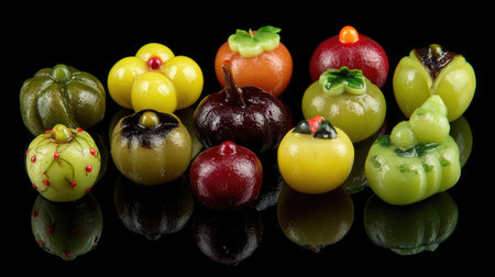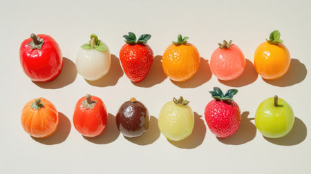 A vibrant assortment of decorative fruit figurines displayed on a reflective surface, showcasing glossy finishes and creative designs, perfect for artistic decor.