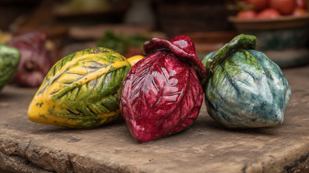 Vibrant ceramic cacao pods displayed on a rustic wooden surface evoke craftsmanship.