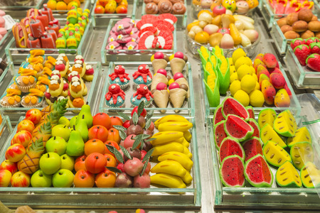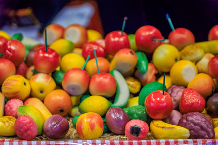 Marzipan fruits in all colors and flavours displayed at Boqueria market in Barcelona