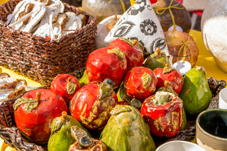 Beautiful layout of the goods of folk art at the fair. Still life of pears or apples and peppers in a wicker basket