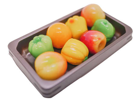 Fruit Shaped Mung Beans or Thai Kanom Look Choup in a brown plastic box On a white background with isolate background.