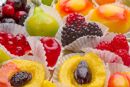 Fruit shaped candies in macro image of marzipan sweets in paper wrappings