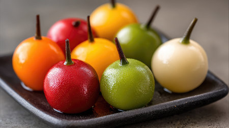 A striking arrangement of colorful miniature fruits displayed on a dark plate, showcasing a variety of glossy textures and vibrant tones perfect for food photography.