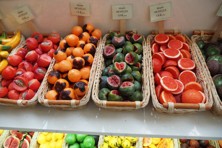 watermelons, kiwis and marzipan persimmons for sale in a candy store