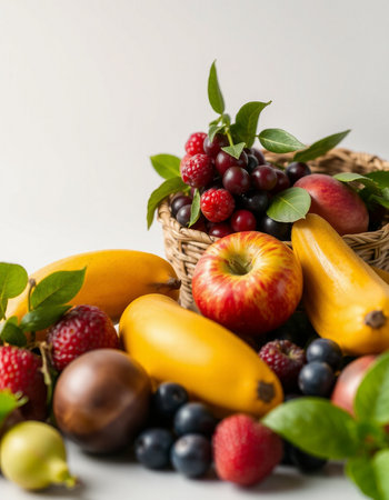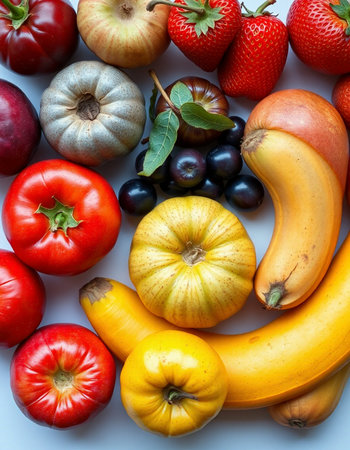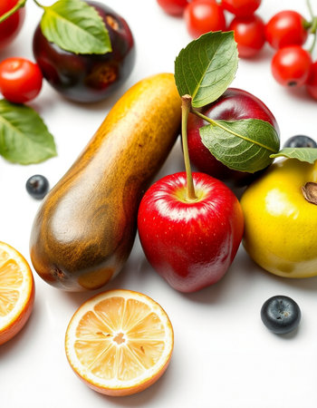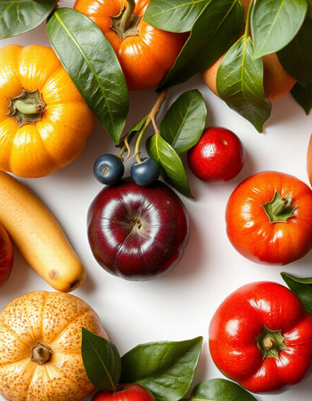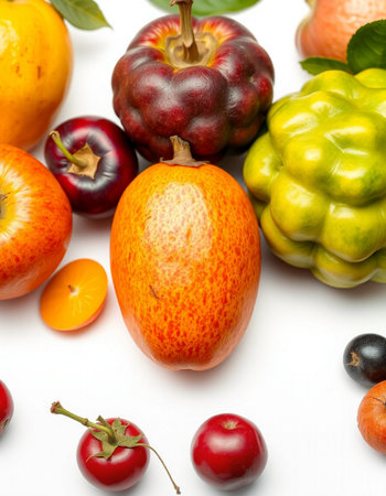 Fresh fruits and vegetables on a white background. Healthy food concept.