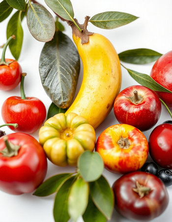 Fruits and vegetables isolated on white background. Healthy eating concept.