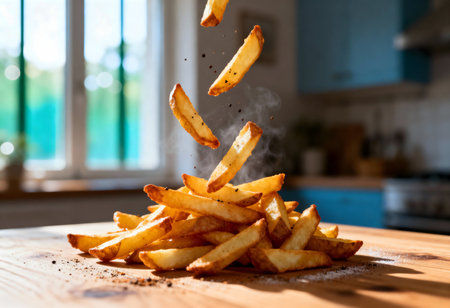 A close up shot of french fries falling onto a wooden surface in a bright kitchen setting