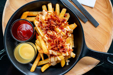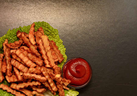 Chips fries and ketchup on a dark background. Top view, Unhealthy food
