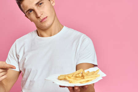 Man with French fries in a paper box on a pink background calories fast food portrait pink background