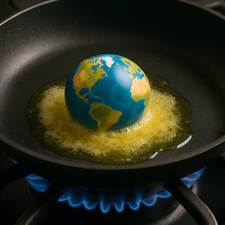 The planet Earth sits in a hot skillet, surrounded by yellow melted liquid, symbolizing climate emergency and dangerous human-driven warming