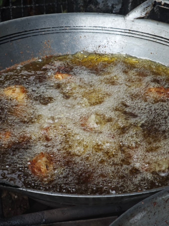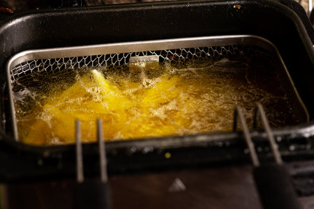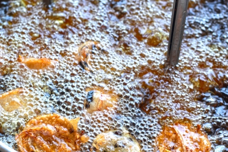 Delicious bites cook in hot oil bubbling and turning golden brown filling the air with savory aromas.
