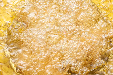 Hot boiling frying oil surface on pan background.