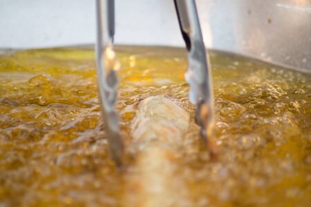 Close up image of cooking chicken nugget tempura in deep fry