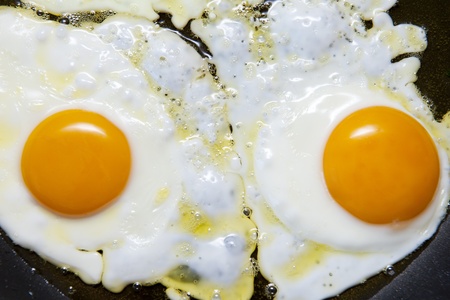Fried eggs in a pan. Fried two eggs. cook an omelet in a pan three yolks. Fried eggs for breakfast close-up.