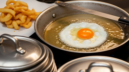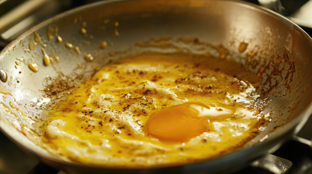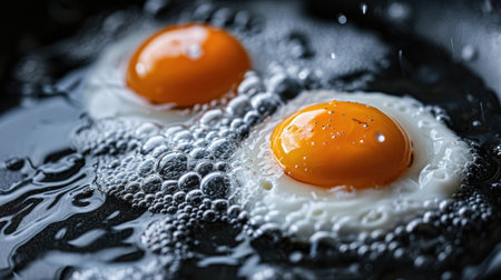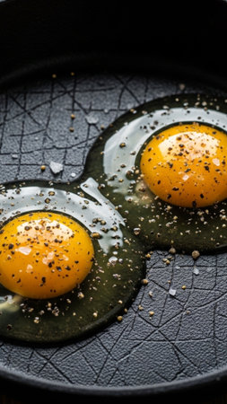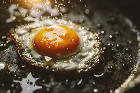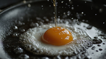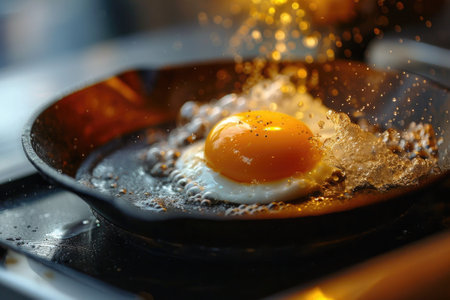 Close-up of an egg yolk splashing in a frying pan with salt crystals, creating a dynamic and appetizing scene. Ideal for food, cooking, and culinary themes.