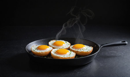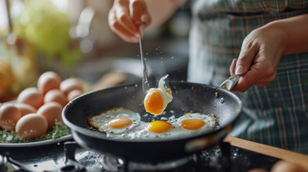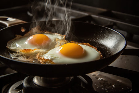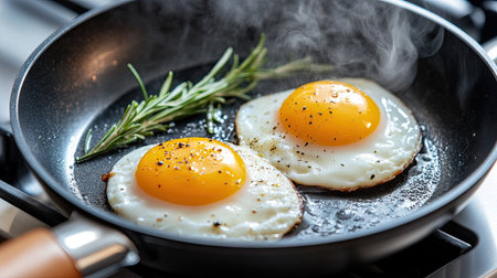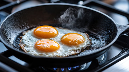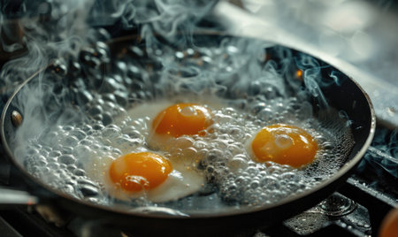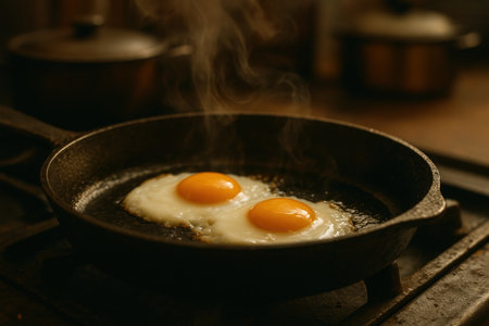Fresh eggs fry in a pan, showcasing golden yolks and steam rising. The cozy kitchen atmosphere highlights the beauty of cooking at home for breakfast.
