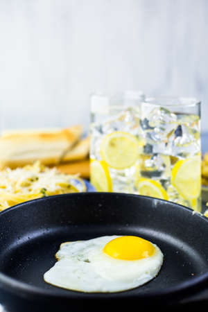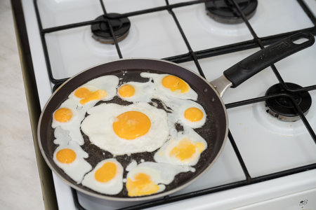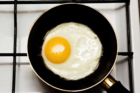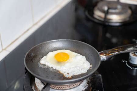 fried egg in a frying pan on a background of the kitchen. Breakfast time.