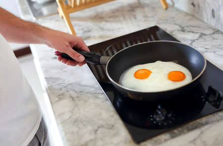 Man fries eggs at the pan while preparing breakfast for himself at the kitchen