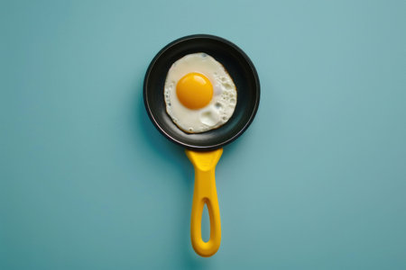 Fried egg in a black frying pan on a light blue background, emphasizing breakfast and cooking concepts with a simple, minimalist aesthetic