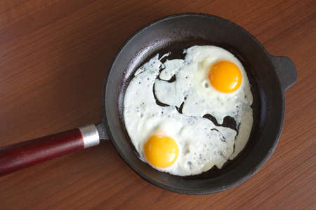 Two appetizing fried eggs in black pan on brown desk closeup