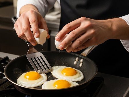 A person frying eggs in a skillet on top of an oven, AI
