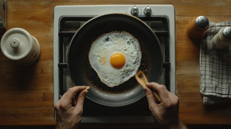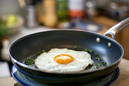 A fresh egg sizzles in a skillet, surrounded by spices, creating a delicious breakfast scene in a cozy kitchen. Ideal for food enthusiasts and chefs.