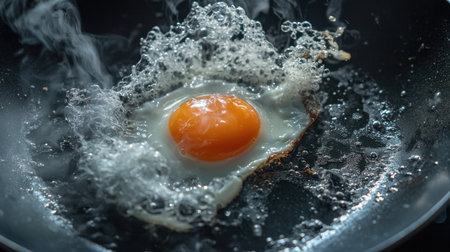A close-up image of a fresh egg frying in hot oil, surrounded by rising steam and bubbling heat. Ideal for culinary and breakfast themes.