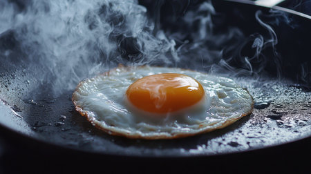 A freshly cooked fried egg sits in a hot non-stick pan, with steam rising to create a visually appealing breakfast scene.