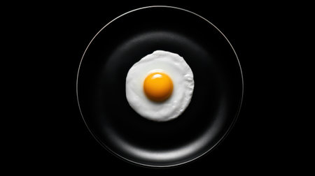 Minimalist composition of one fried egg centered on a round black plate with high contrast lighting.