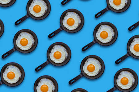 Cast iron frying pan with a fried egg on a blue background. Seamless pattern